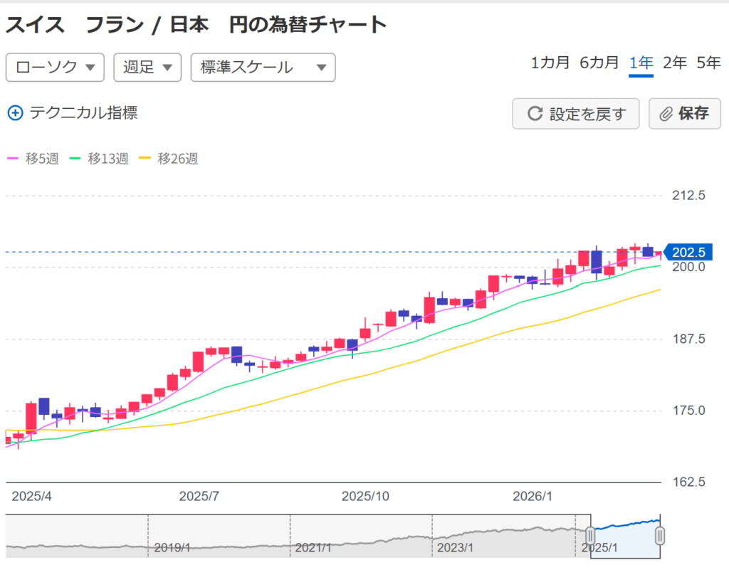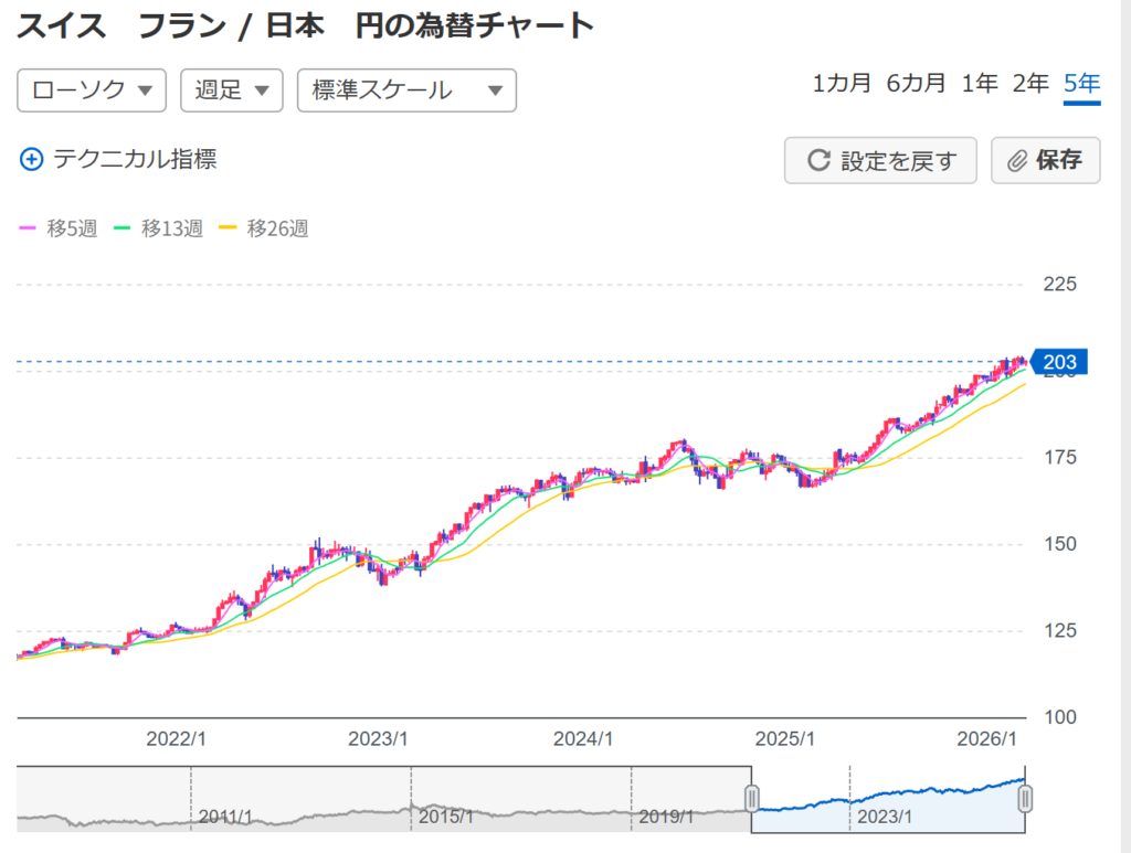1CHF(スイスフラン)=200円で換算している2026年現在の状況について解説するので、ぜひ参考にしてみてください。